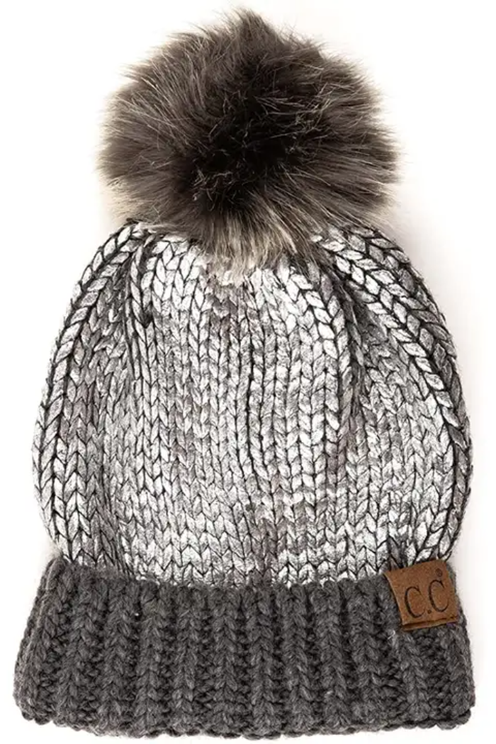 C.C. Silver Metallic Foil Knit Faux Fur Pom Beanie