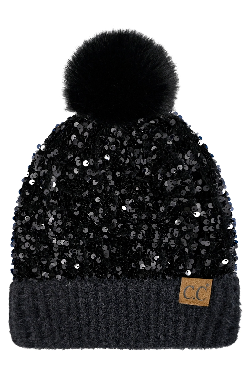 C.C. Black Sequin Pom Beanie