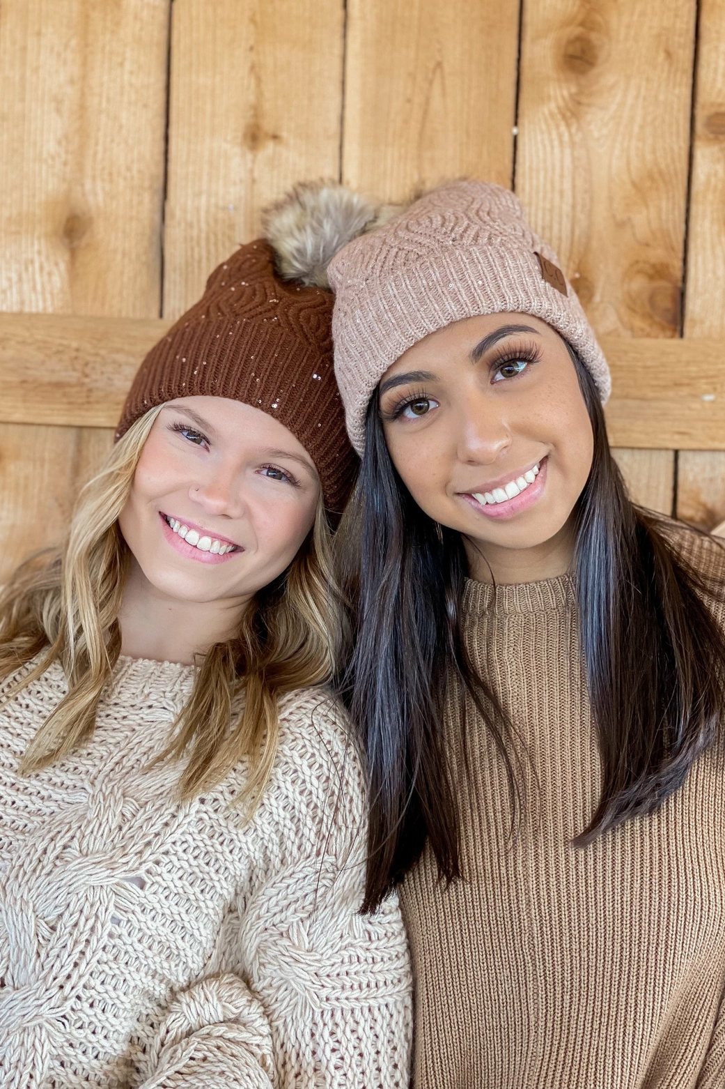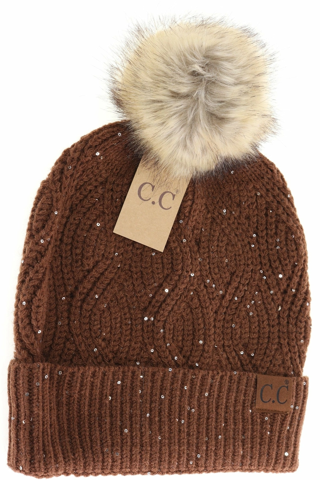 C.C. Coffee Sequin Brioche Cable Knit Fur Pom Beanie