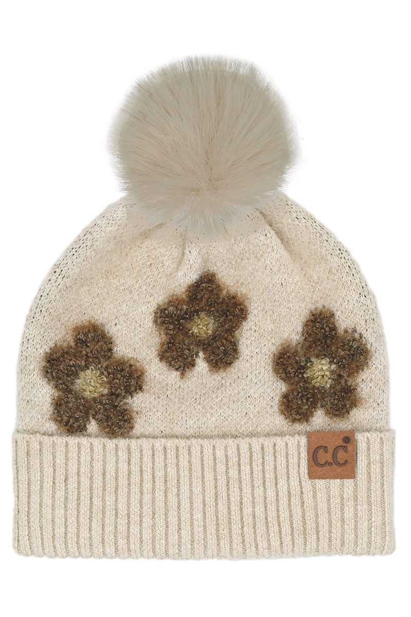 C.C. Heather Beige Daisy Chenille Pom Beanie