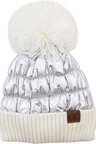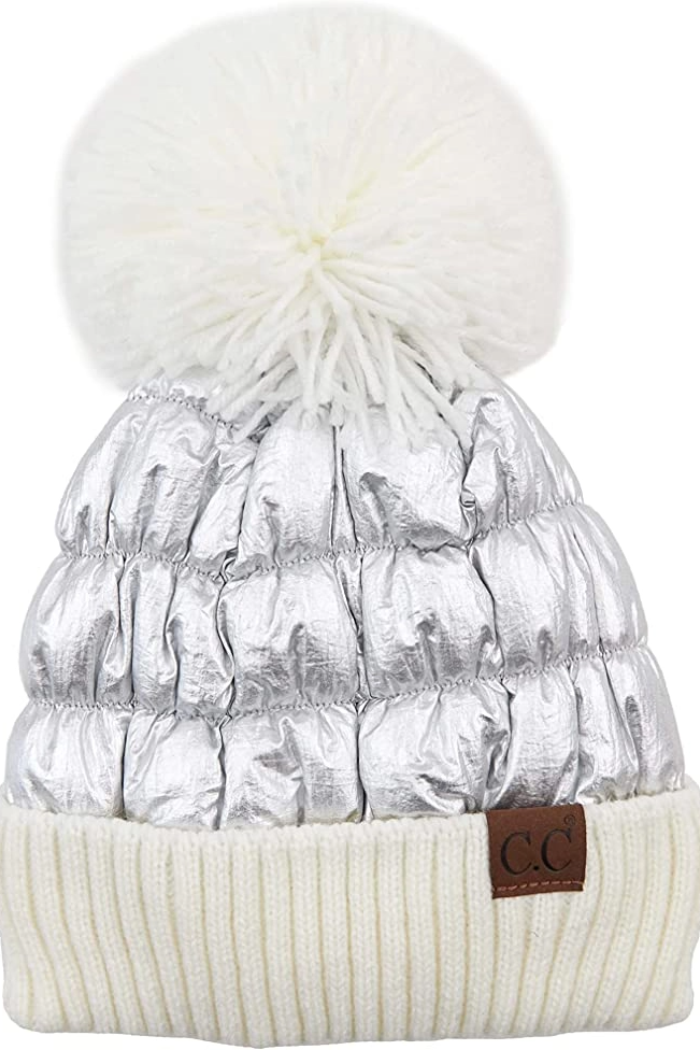 This trendy puffer pom hat is 60% polyester and 40% Acrylic and includes cozy features such as puffer-like baffling, a knit pom and cuff, and a super soft fleece lining for all day comfort. Unlike most fabrics that absorb moisture, our beanie repels moisture and dries quickly so you can stay dry and avoid stains. Hand wash cold. Lay out or hang to dry.