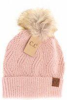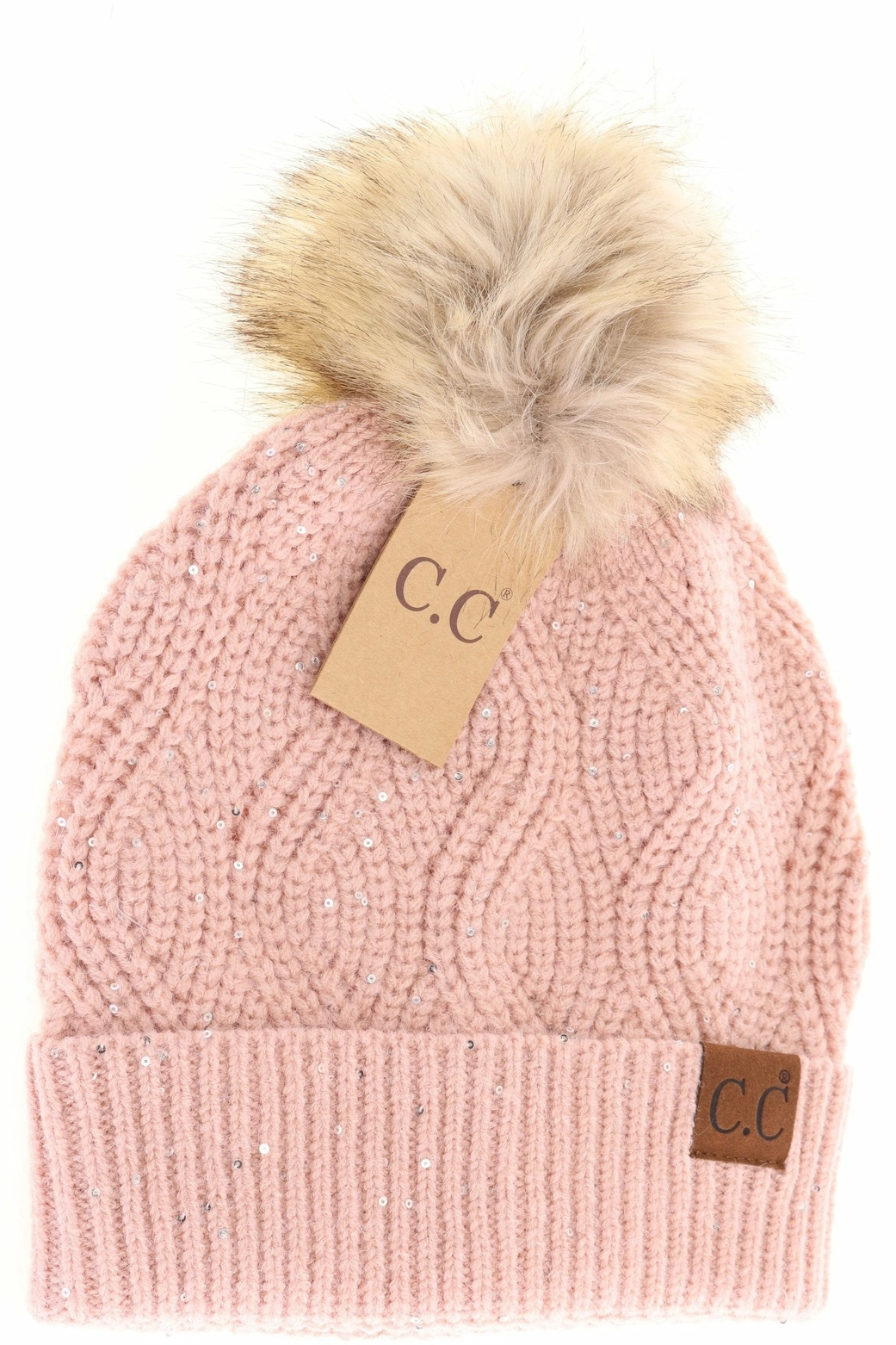 C.C. Rose Sequin Brioche Cable Knit Fur Pom Beanie