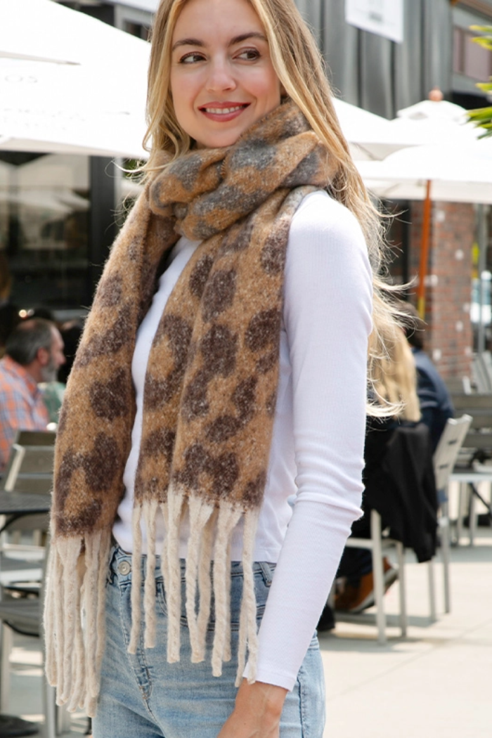 A plush oblong scarf in a camel leopard print finished with long fringe brings instant texture to any outfit. The Comfy Luxe Camel Leopard Print Oblong Scarf Shawl with Fringe is soft, slightly fuzzy, and generously sized to wear as a wrapped scarf or lightweight shawl. Its neutral camel and brown tones make it an easy layering piece for cool-weather looks and casual city styling.
