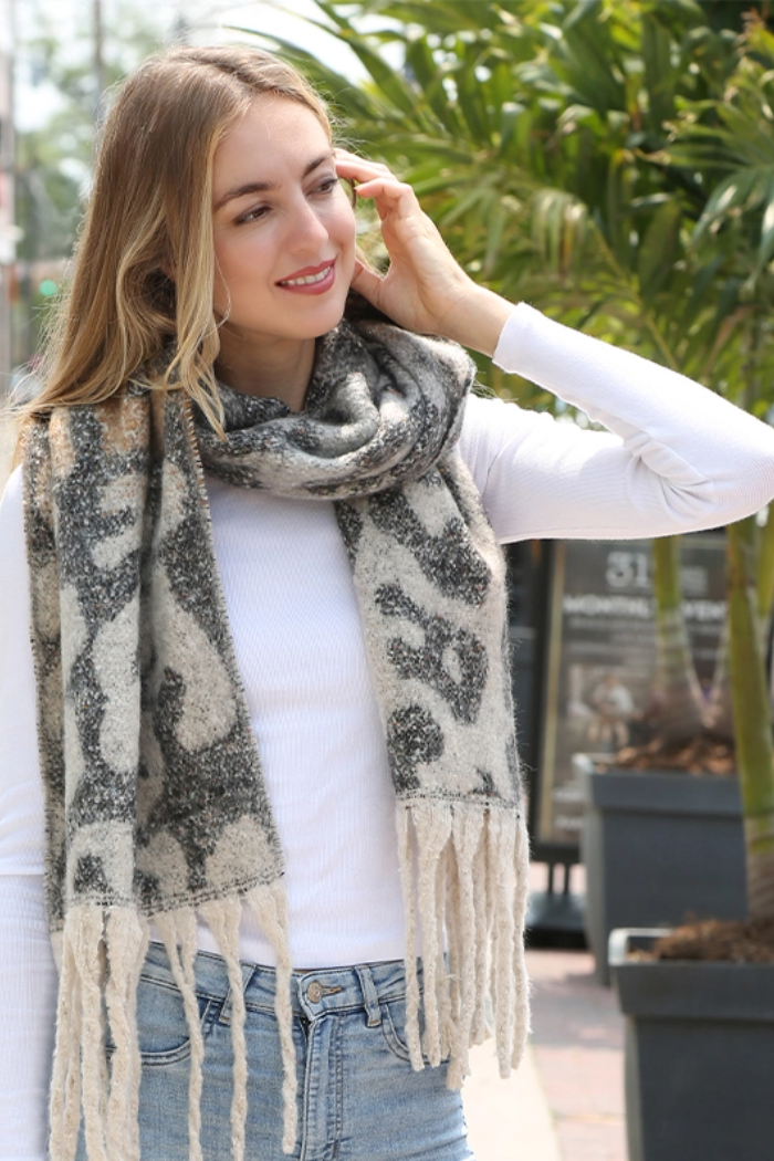 A plush oblong scarf-shawl in a white and gray leopard pattern finished with long fringe for cozy layered styling. The Comfy Luxe White Leopard Print Oblong Scarf Shawl with Fringe drapes easily over shoulders or wraps snugly around the neck for extra warmth. Soft textured knit and generous proportions give it a relaxed, elevated look that pairs well with casual denim or a tailored coat.