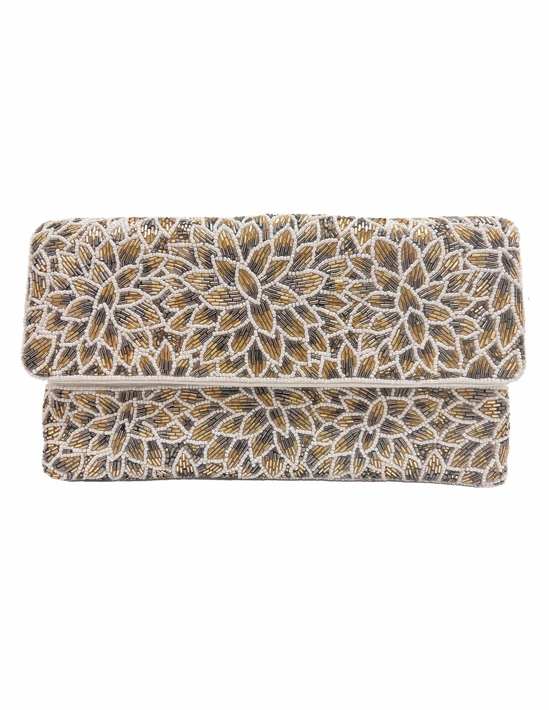 Pizzaz Silver & Gold Flowers Beaded Clutch - Beaded Evening Clutch