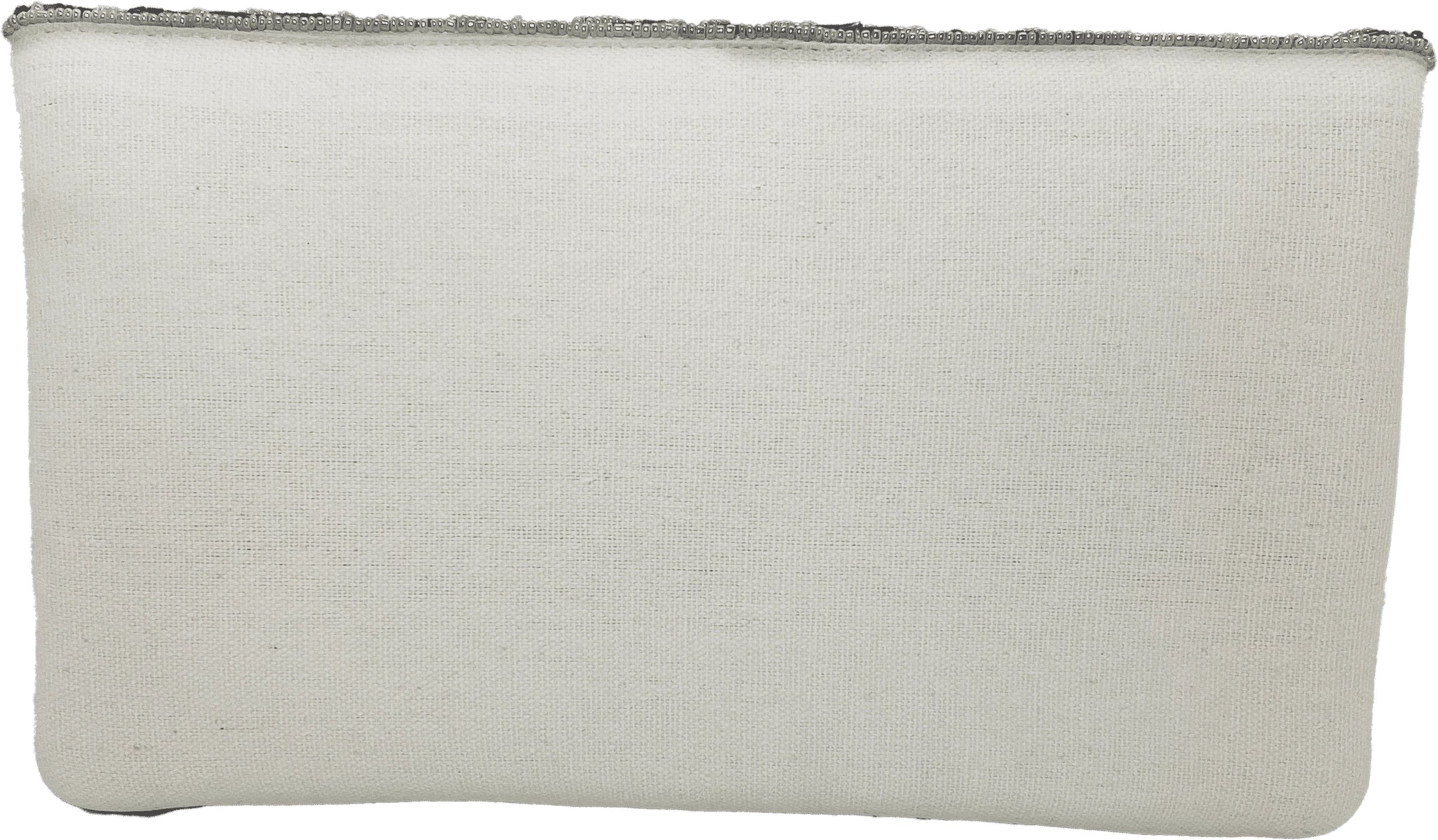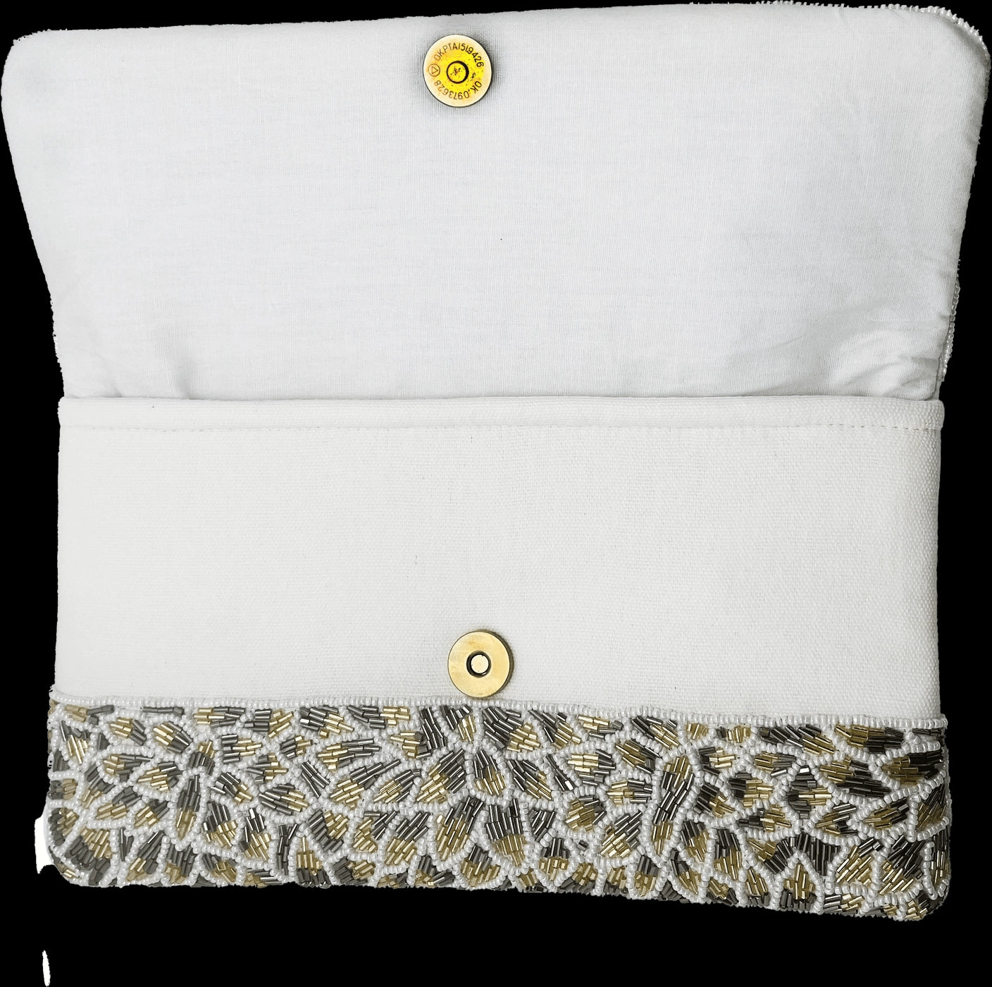 A hand-beaded evening clutch patterned with silver and gold floral motifs and a structured foldover silhouette. The Pizzaz Silver & Gold Flowers Beaded Clutch is crafted on a fabric base with intricate seed and bugle beadwork for luminous texture. Pizzazz Inc. designed this compact clutch for formal occasions and nights out when you want a statement accessory. Its slim shape slips easily into hand or under the arm for polished finishing touches.