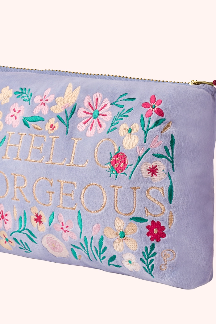 A velvet zip pouch embroidered with colorful florals and the phrase “Hello Gorgeous,” finished with a bright tassel zipper pull. The Powder Design Floral Velvet Embroidered Zip Pouch is sized for cosmetics or small essentials and has a soft, plush texture with detailed stitched motifs. Powder’s playful design makes it a pretty everyday accessory for travel or your handbag.Fabric: 100% polyester velvet. Do not wash, do not iron, do not bleach, do not dry clean.