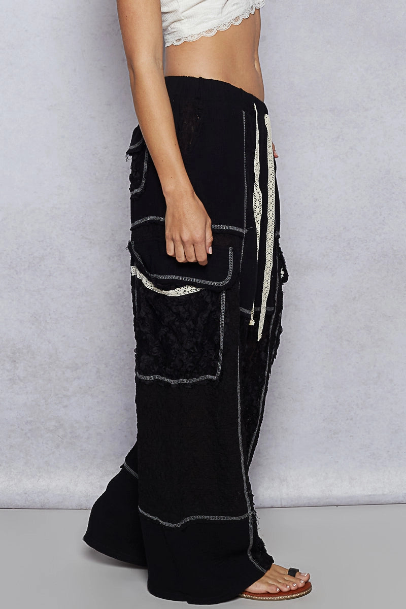 Designed in wide pants in woven with lace patch, side pocket, color blocked overlock stitch point, elastic waist band with loop, outseam, solid color, normal washing.