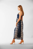 A navy maxi patterned with ivory floral embroidery, this Julia Jordan Navy & Ivory Maxi Dress has a fitted bodice and full skirt for graceful movement. The dress from Julia Jordan features wide shoulder straps and detailed embellishment down the front and hem for a refined, romantic look. Wear it to wedding events, summer soirées, or destination dinners when you want an elegant yet relaxed silhouette.