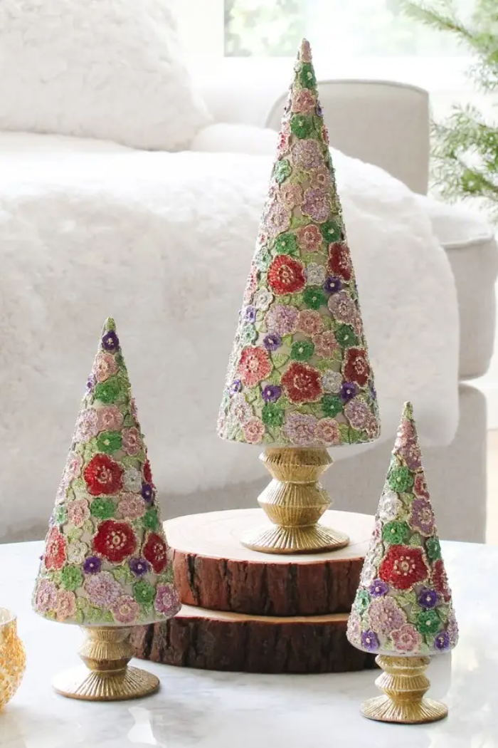 Dekorasyon 13" Champagne Rose Beaded Petals Cone Tree