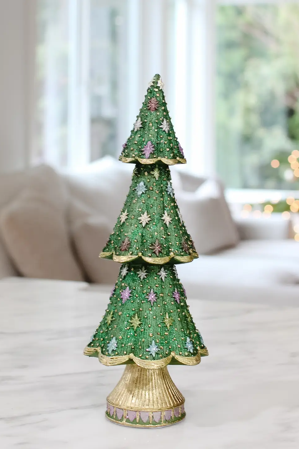 A festive tabletop cone tree with layered tiers and glittering star accents, perfect for seasonal display. The Dekorasyon 13" Starlight New Cone Tree brings a vintage-inspired holiday look with green textured foliage, pastel stars and a gold fluted base. Its compact 13-inch size makes it ideal for mantels, consoles, or as part of a holiday vignette. Dekorasyon designed this decorative tree to add a delicate, celebratory sparkle to small spaces.