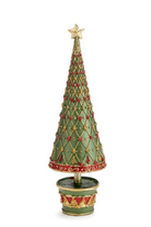 This Dekorasyon Green Fleur De Lis Tree With Drum Base is a sculptural holiday tabletop accent finished in muted green, gold, and red details. The cone-shaped tree features a lattice of fleur-de-lis motifs and a drum-style base topped with a small star for a vintage-inspired look. Dekorasyon brings festive charm to mantels, console tables, or seasonal vignette displays with this decorative piece.