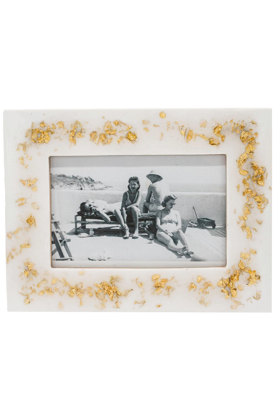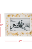A decorative 4x6 picture frame with scattered gold flakes set into a white resin surround. The Foreside Home & Garden 4x6 Chryses Picture Frame Gold Flake pairs vintage-inspired charm with modern materials for a subtle luxe look. It holds a standard 4 by 6 photo in a rectangular opening and stands or hangs for flexible display. Use it on a shelf, mantel, or bedside table to highlight treasured snapshots.