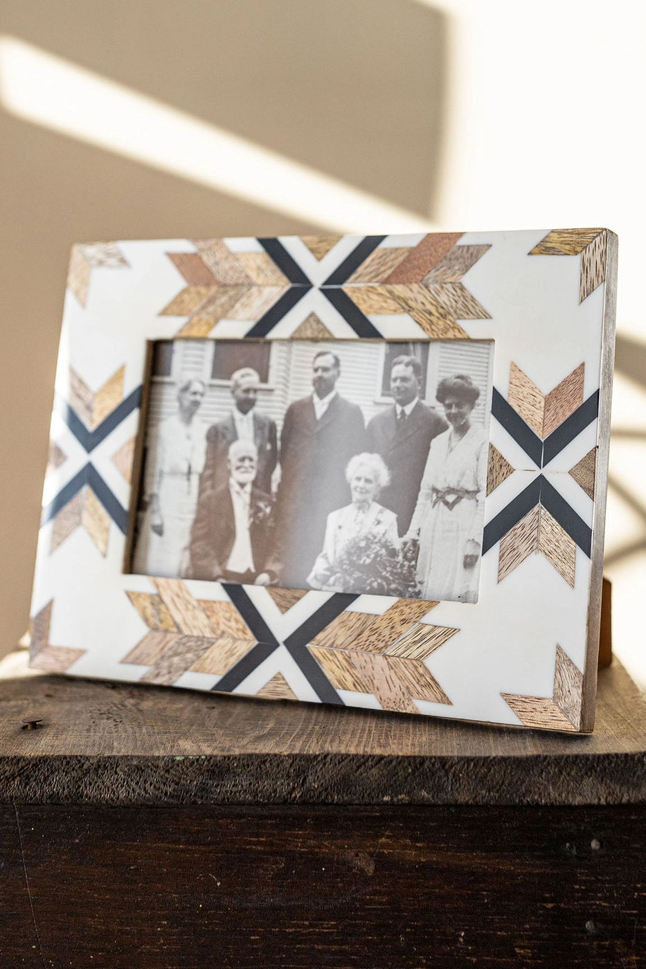 This Foreside Home & Garden 4x6 Western Decor Picture Frame is a tabletop frame sized for a 4x6 photo with a Western-inspired geometric inlay. The frame features wood-toned accents on a white background and a stand-back for easy display on shelves or consoles. Its rustic, farmhouse-ready styling makes it an easy way to add warmth and personality to a mantel, entry table or gallery shelf.
