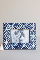 The Foreside Home & Garden Celestina 4x6 Blue Resin Mosaic Frame is a decorative tabletop picture frame with a geometric blue resin mosaic border and a 4x6 photo opening. The glossy resin tiles create a textured, artisanal look that fits coastal or modern eclectic decor. Brand Foreside Home & Garden lends a curated, giftable quality to this compact frame.