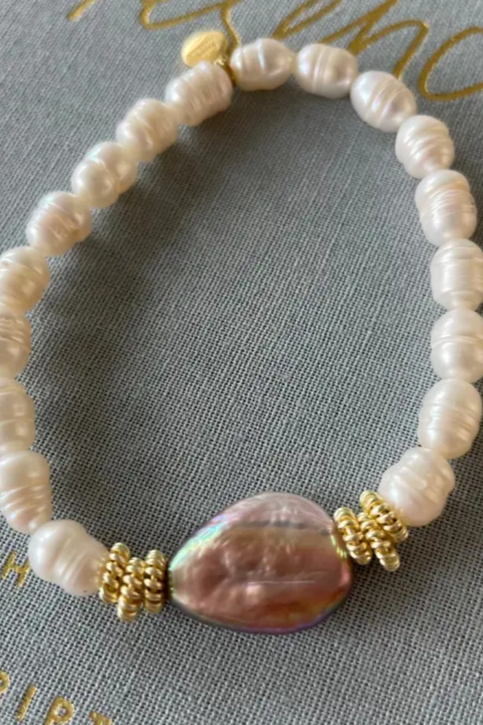 A delicate stretch bracelet threaded with cream freshwater pearl beads and gold-tone spacer rings centered around a larger iridescent pearl focal. The Cola Stacks Charlotte Bracelet pairs understated elegance with easy everyday wear thanks to its flexible silhouette. Cola Stacks designed this piece to layer effortlessly with other bracelets or stand alone as a simple statement accessory.