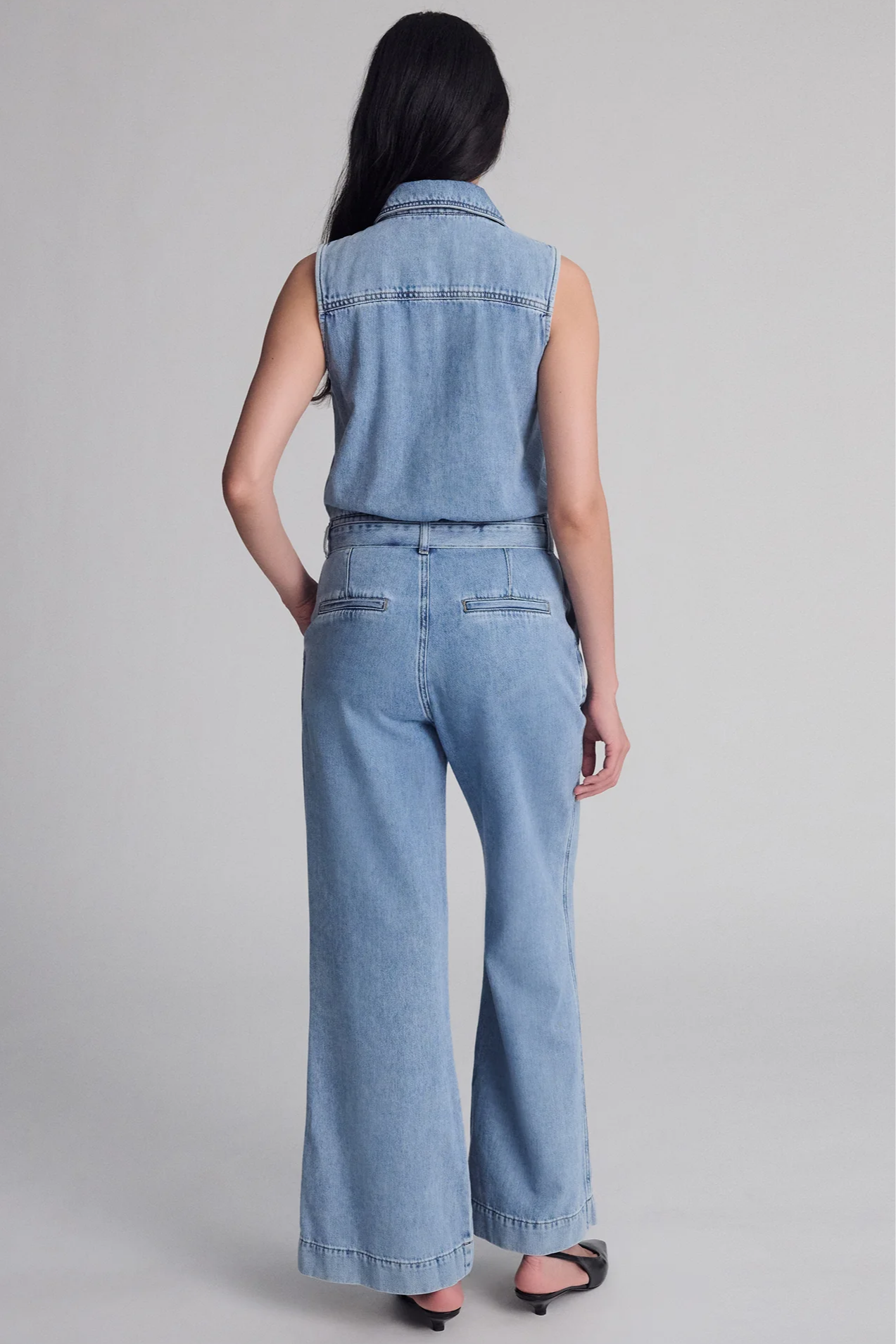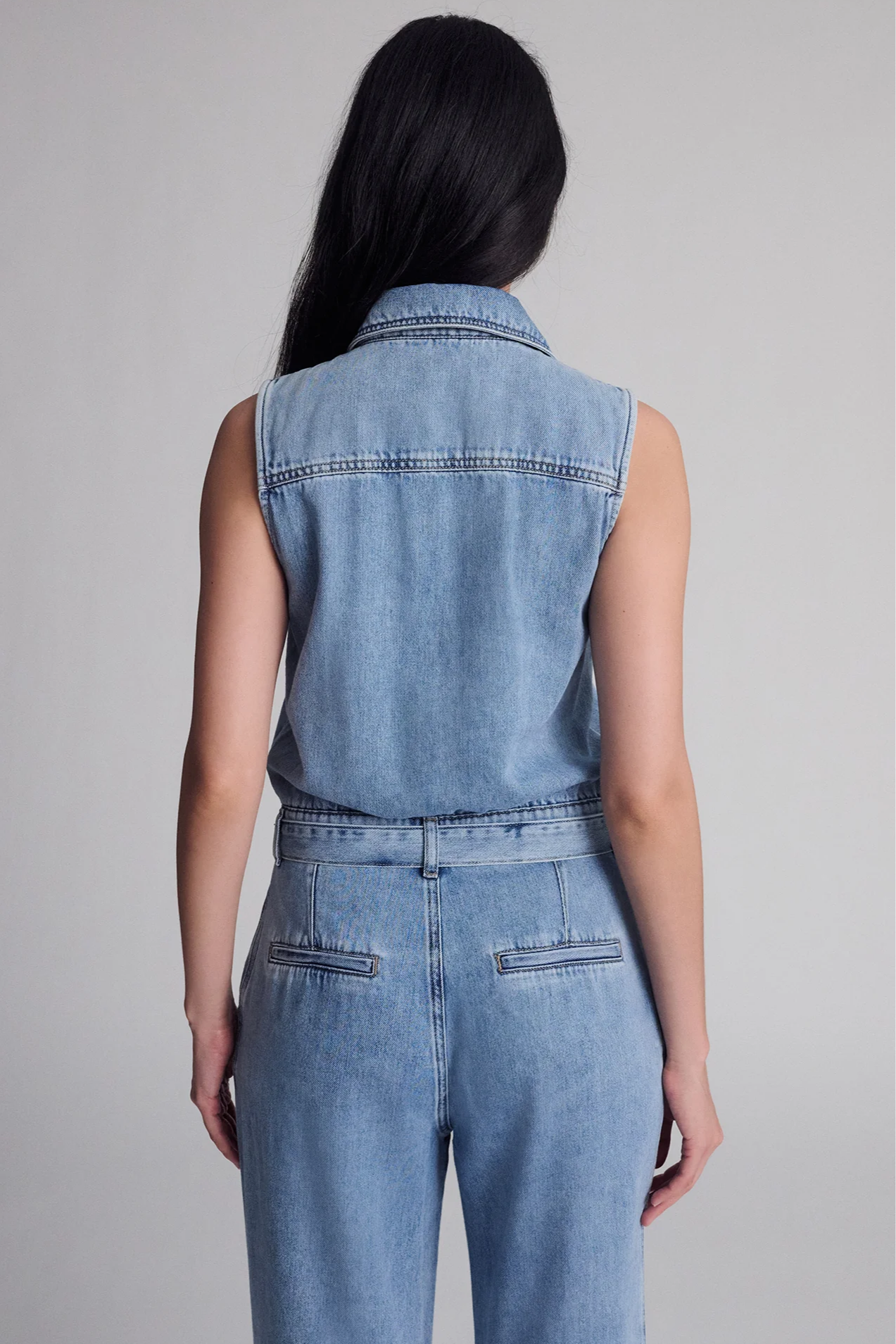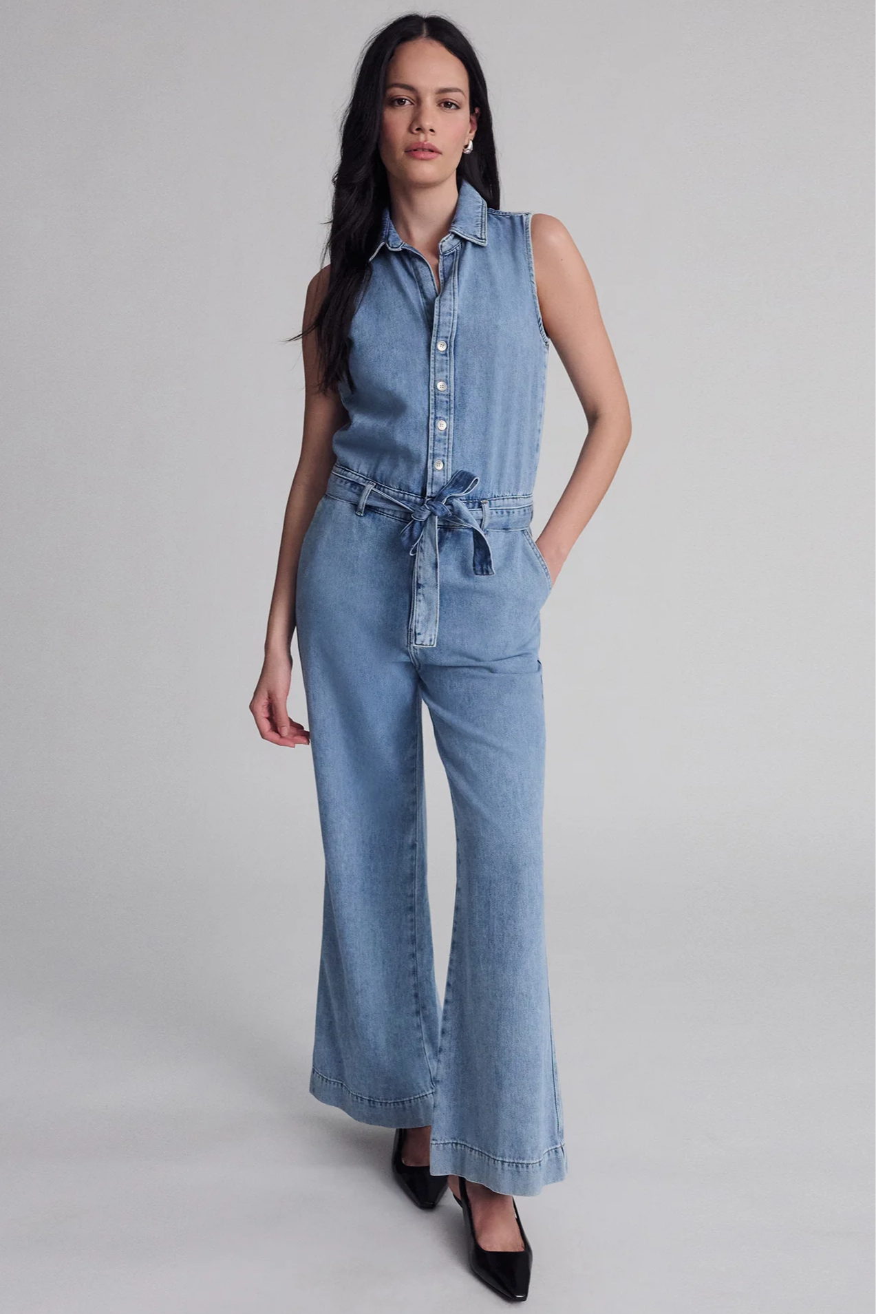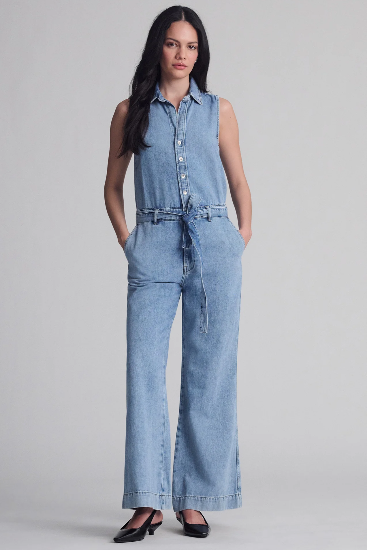 This sleeveless denim jumpsuit is made from a cotton and Tencel™ blend for comfort and breathability. It features a button-up front, tie waist, and wide-leg silhouette for an easy, polished look.