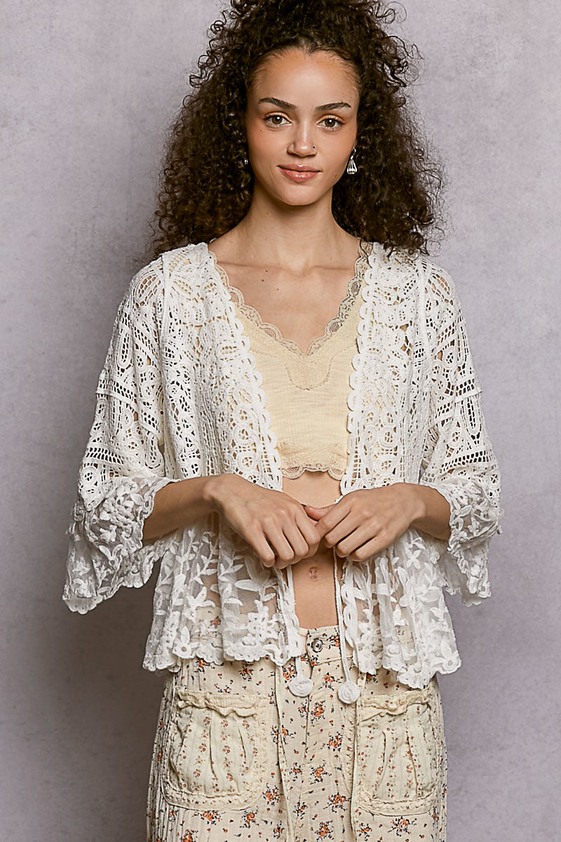 Pol Natural V Neck Short Sleeve Crochet & Lace Cardigan