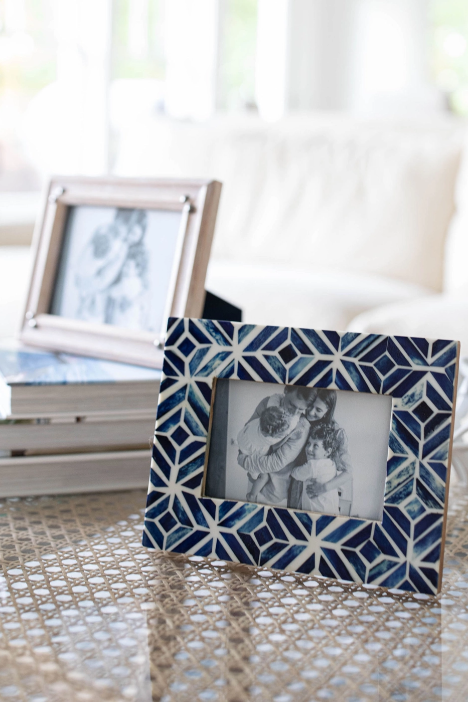 The Foreside Home & Garden Celestina 4x6 Blue Resin Mosaic Frame is a decorative tabletop picture frame with a geometric blue resin mosaic border and a 4x6 photo opening. The glossy resin tiles create a textured, artisanal look that fits coastal or modern eclectic decor. Brand Foreside Home & Garden lends a curated, giftable quality to this compact frame.