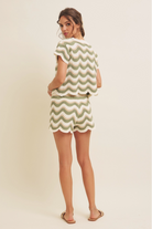 A breezy oversized sweater top in sand and olive wavy multi-stripe knit with a relaxed silhouette and short sleeves. The In February Sand/Olive Wavy Multi-Stripe Oversized Sweater Top pairs a crew neckline with scalloped edges and open-knit detailing for a light, textured finish. It's crafted from a sweater knit that reads casual yet polished, perfect for warm-weather weekends or layered cool evenings. Style it with the matching shorts or denim for an easy summer-vacation look.