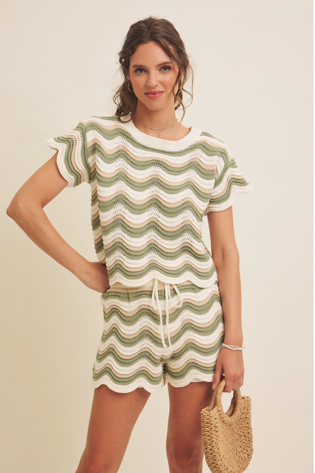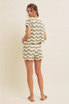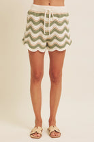 The In February Sand/Olive Wavy Multi-Stripe Shorts are a knit, wave-striped short with a scalloped hem and a soft elastic drawstring waist. Designed by In February, they feature airy crochet-like texture in sand, olive and cream tones for a relaxed, beach-ready look. Pair them with a simple tank or slide sandals for casual summer days or vacation styling.