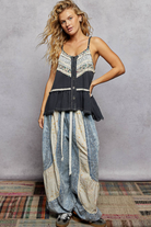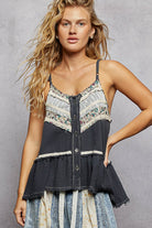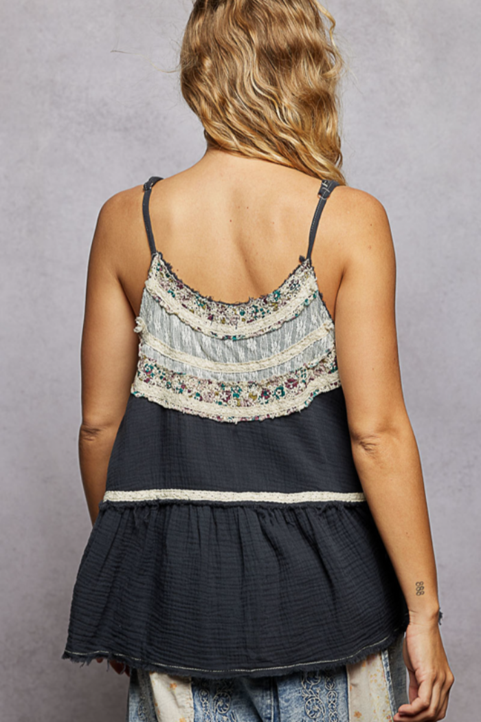 A breezy tank with layered floral and lace panels, framed by adjustable thin straps and a relaxed peplum hem. The Navy Charcoal Floral & Lace Tank Top mixes textured gauze fabric with delicate trim for a handcrafted bohemian look. POL designs this piece for casual weekend wear or easy warm-weather travel.