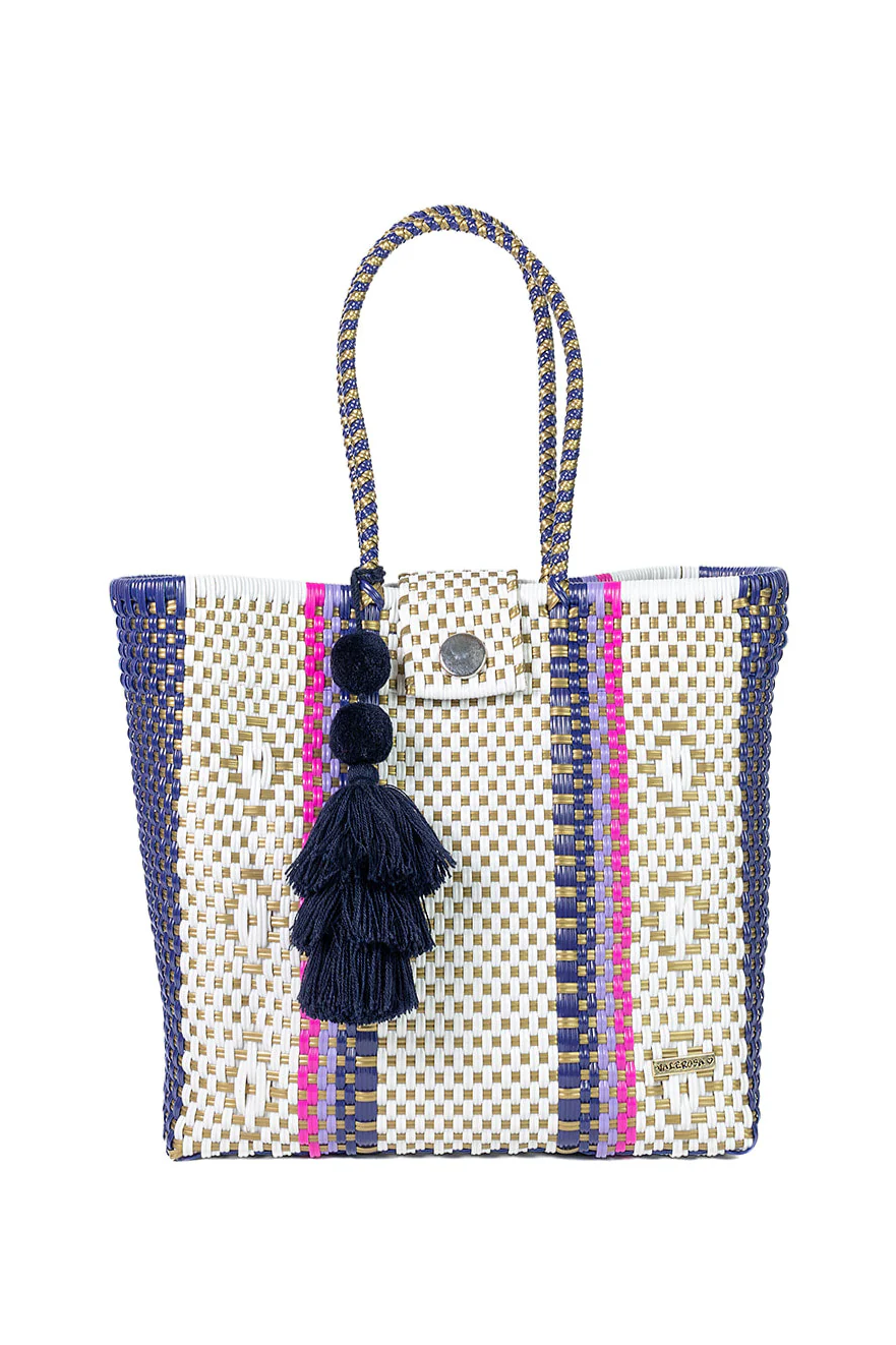 A lightweight woven beach tote with bright stripe detailing and tasseled charm, the Peony Hombro Bag is made for sunny days and effortless carry. The roomy silhouette and braided shoulder handles give it a relaxed, grab-and-go feel perfect for weekend errands or seaside escapes. This style is offered by Valerosa and is crafted in a straw-like woven material suited to beach vacations and off-duty looks.