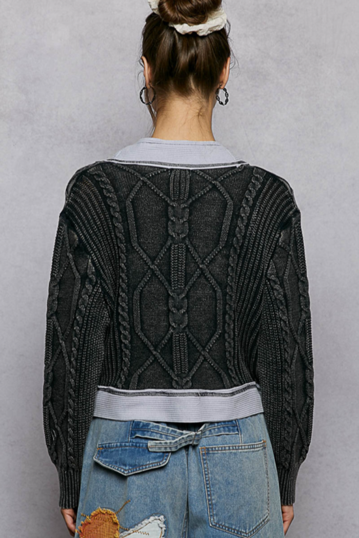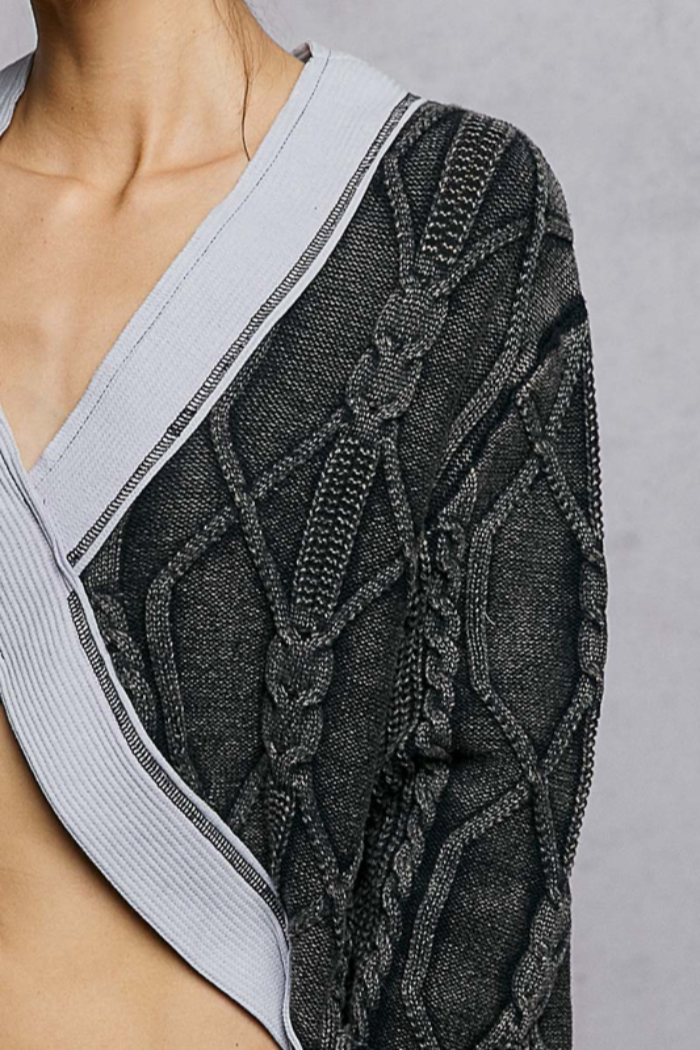 The Pol Clothing Midnight Navy Knit Wrap Sweater is a cropped, cable-knit wrap sweater with contrast ribbed trim that crosses at the waist and forms a deep V-neck. POL constructs it from a soft knit and finishes it with balloon long sleeves for a cozy, modern silhouette. Style it with high-rise jeans or a skirt for an easy on-trend look.