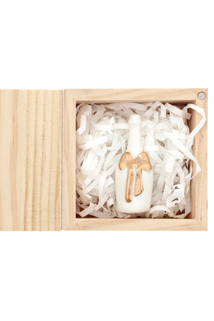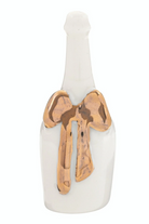 A small ceramic champagne bottle perfect for gifting or shelf display, presented in a natural wooden box. The Santa Barbara Design Studio Ceramic Champagne Bottle features glossy white glaze and a metallic gold bow accent for a festive touch. Its compact, hand-decorative silhouette makes it a charming tabletop accent or keepsake for celebrations. Packaged with shredded paper, it arrives ready for gifting or special-occasion décor.