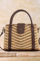 The Winding Road Medium Rattan Handbag With Leather Trim is a structured top-handle bag woven from natural rattan with contrasting leather trim and handles. Its compact silhouette and detachable crossbody strap make it equally suited for errands or weekend getaways. The Winding Road brand crafted this piece with visible leather accents and a secure tab closure for everyday ease. Pair it with warm-weather looks for an off-duty, beach-vacation vibe.