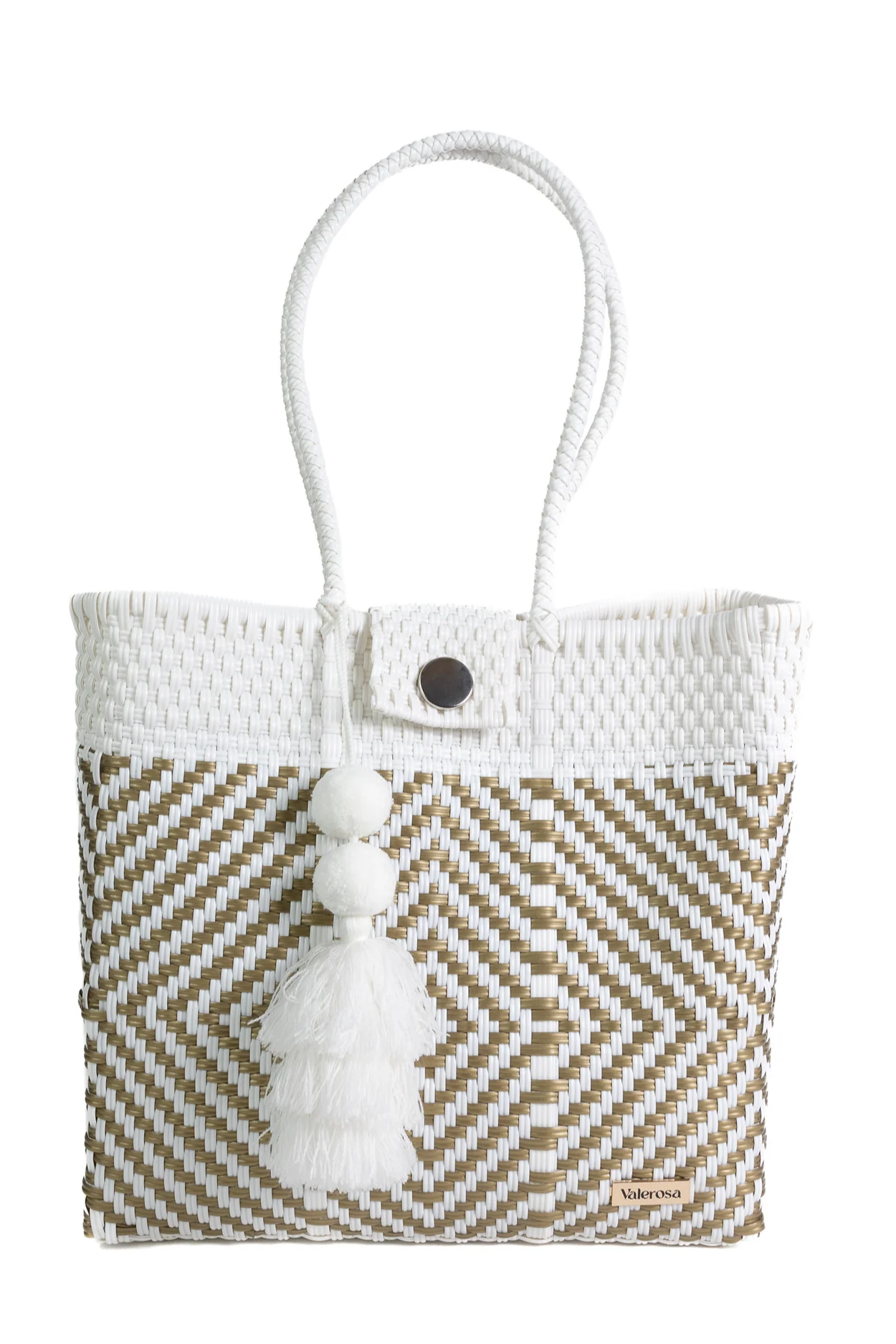 The Valerosa Quiet Luxury Hombro Bag is a woven shoulder tote with a roomy rectangular silhouette and braided handles. It features white-and-tan straw-like weaving and playful pom-pom tassel detailing for a relaxed, coastal feel. Valerosa designs this tote for easy beach days or off-duty weekends when you want a stylish yet casual carryall.Quiet Luxury is for the ladies who seek classic elegance and versatility but without a low of show. Featuring a crisp white background and gold geometric details, this pattern is sure to compliment any outfit. Finished with a complimentary Pom, this tote is perfect for your next resort getaway.