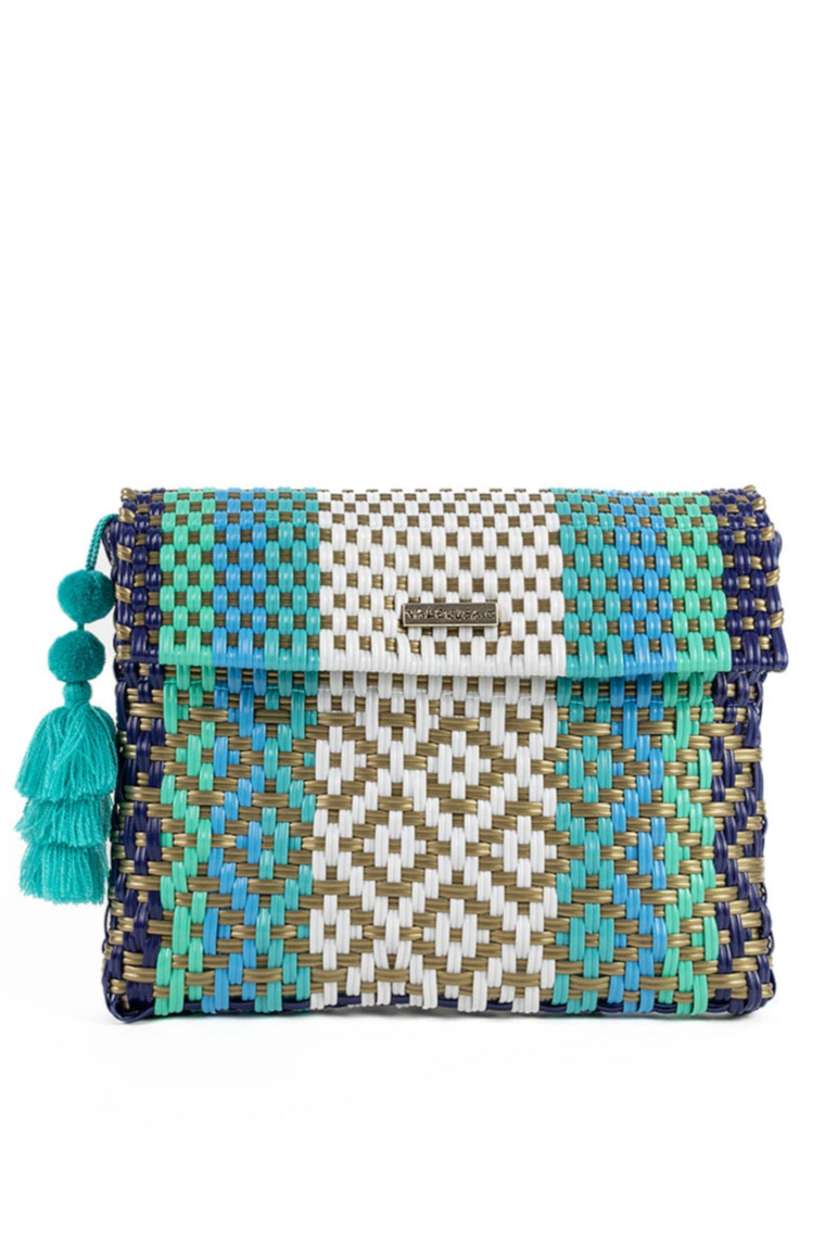 A colorful woven clutch with a playful tassel, the Valerosa Waves Clutch adds seaside flair to any outfit. Valerosa designed this compact pouch in a straw-like woven texture with turquoise, blue and white patterning for a breezy, beach-ready look. Sized to hold essentials, it transitions easily from daytime vacation wear to on-the-town evenings.