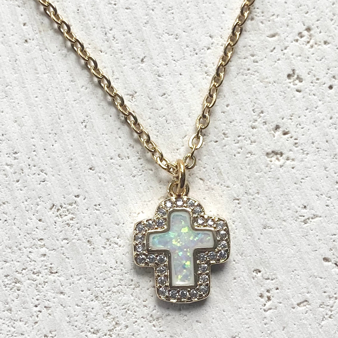 This small opal cross is on a dainty chain. It has clear sparkly micro pave crystals. 18" Stainless steel non tarnish chain.