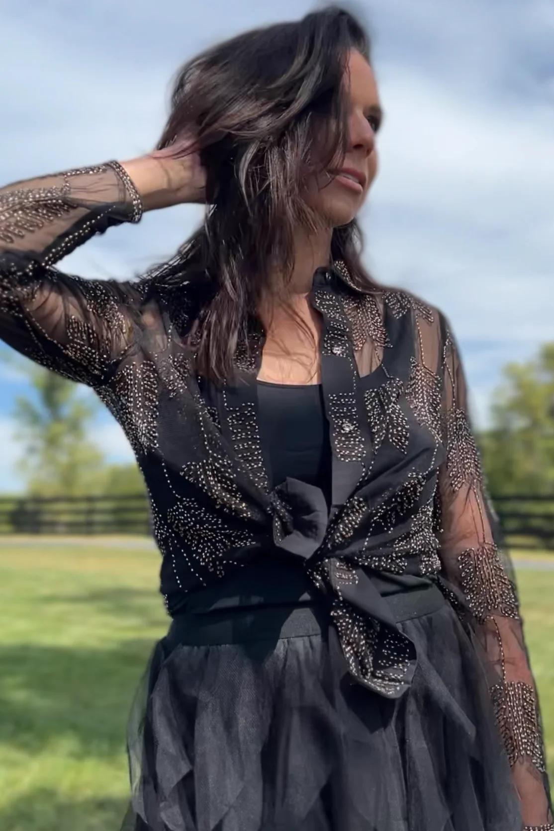 Beads&sequin embroidered on mesh long sleeve blouse (Gold)