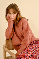 -Oversized long-sleeved sweater-Round neckline-Ruffles and lace appliqués on the front and shoulders