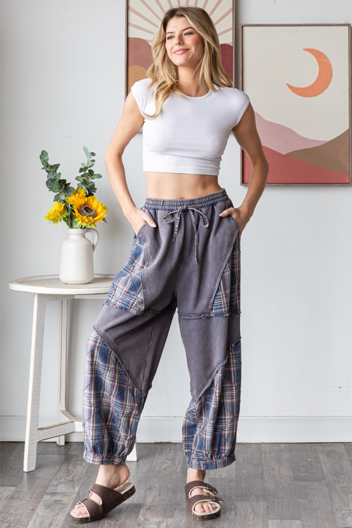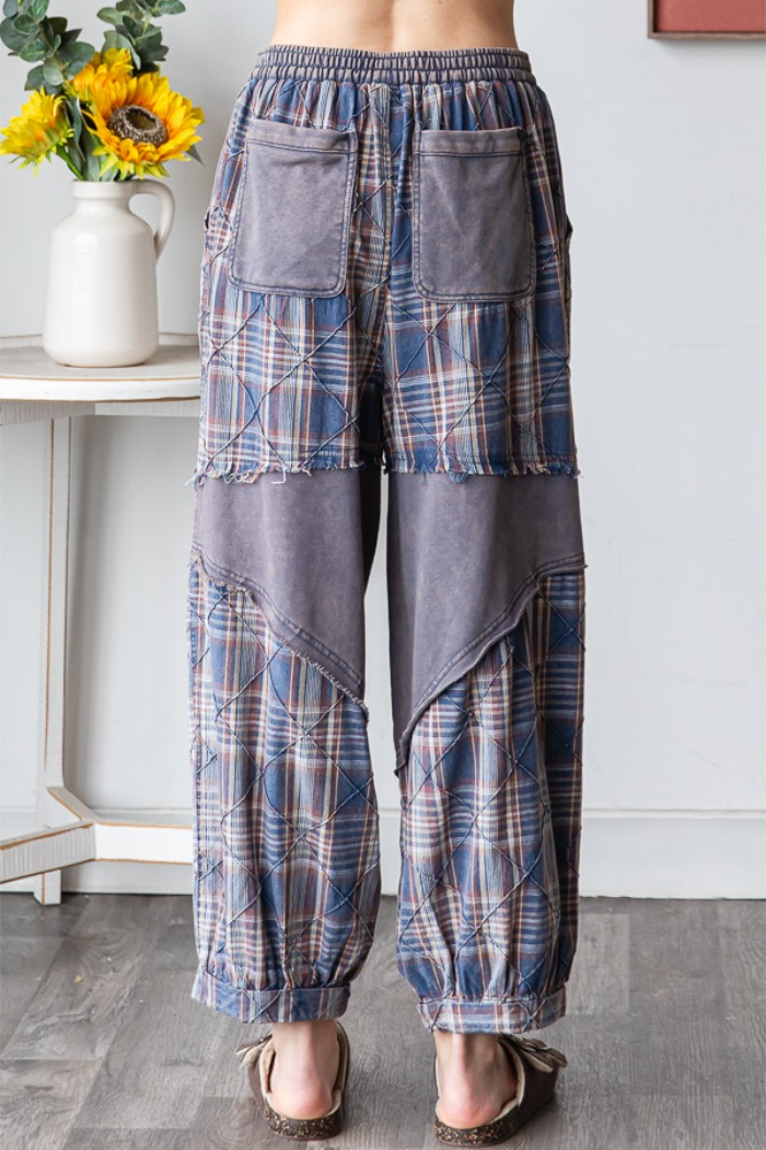 WASHED PLAID MIXED TERRY QUILTING DETAIL PANTS