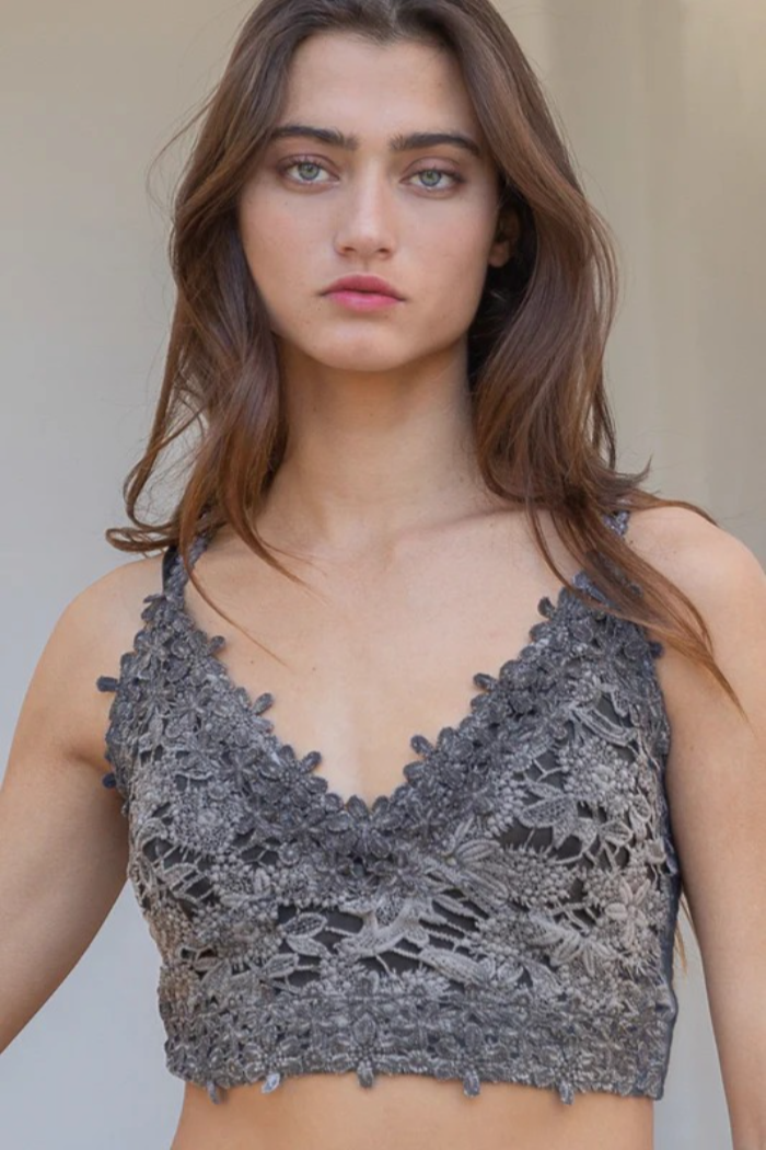 Effortless and edgy, the POL Charcoal Bralette is your go-to piece for both comfort and style. Crafted with a soft, stretchy fabric and delicate lace accents, this bralette offers light support and a flattering fit that moves with you. The deep charcoal hue adds a touch of moody sophistication, making it easy to wear on its own or layered under your favorite tops.