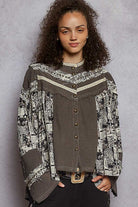 Stay effortlessly stylish and comfortable with this unique top, designed in a high neck silhouette featuring slightly balloon sleeves and a relaxed fit for easy movement. This style is blended with cozy thermal or classic denim panels and boasts a striking printed contrast that adds visual interest, complemented by subtle stud details for an edgy finish. Perfect for layering or wearing on its own, this versatile piece brings a modern twist to your everyday outfit.