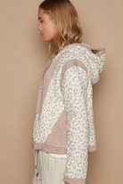 Designed in long sleeve regular fit hoodie jacket top in printed double gauze with quilting, cut and sew patch, zipper, front pocket, vintage washing, floral pattern.