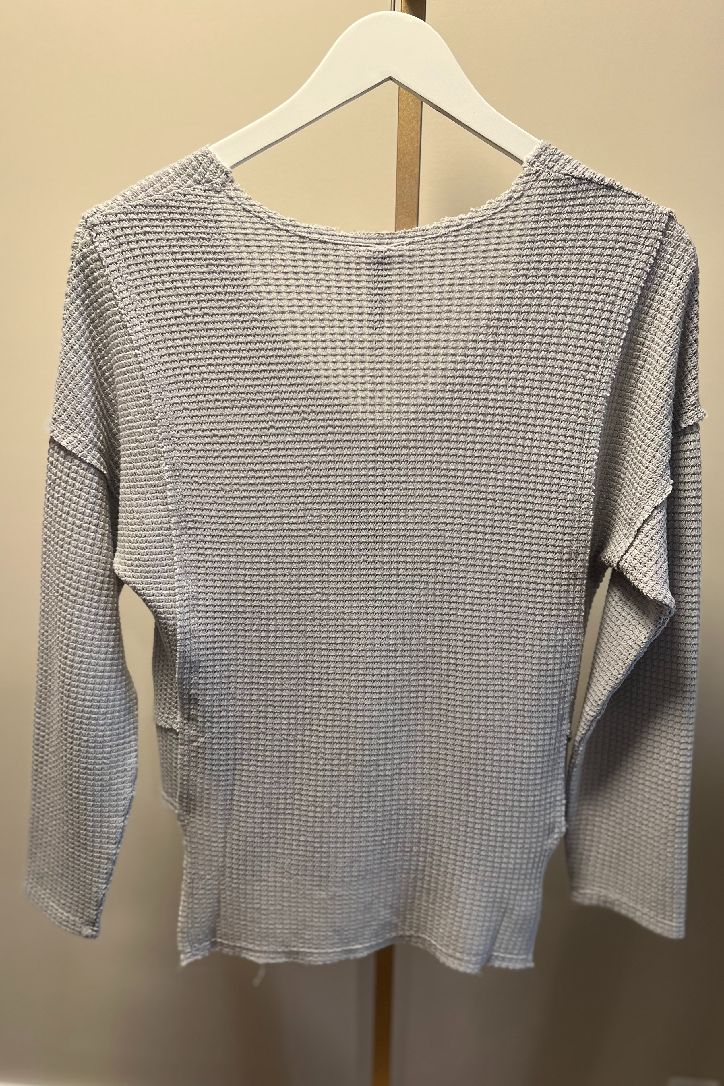 This top is that perfect thermal staple for your closet this Fall into Winter! Cozy, cute, and comfy! This goes with literally everything! The hem has raw edge detail for a unique look.