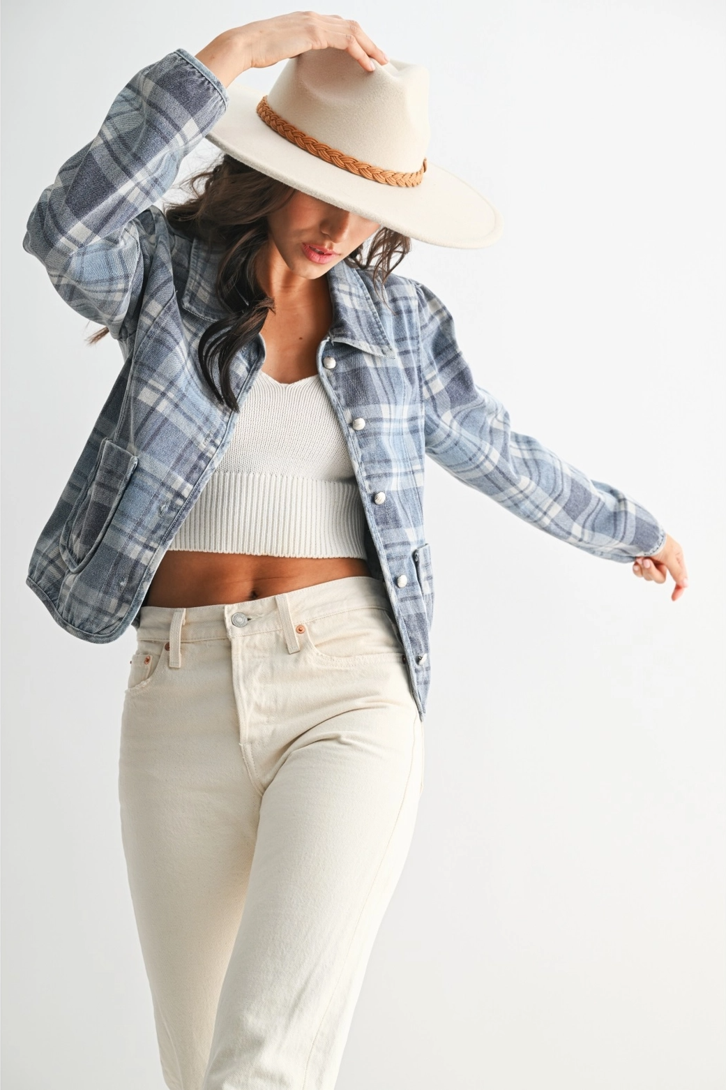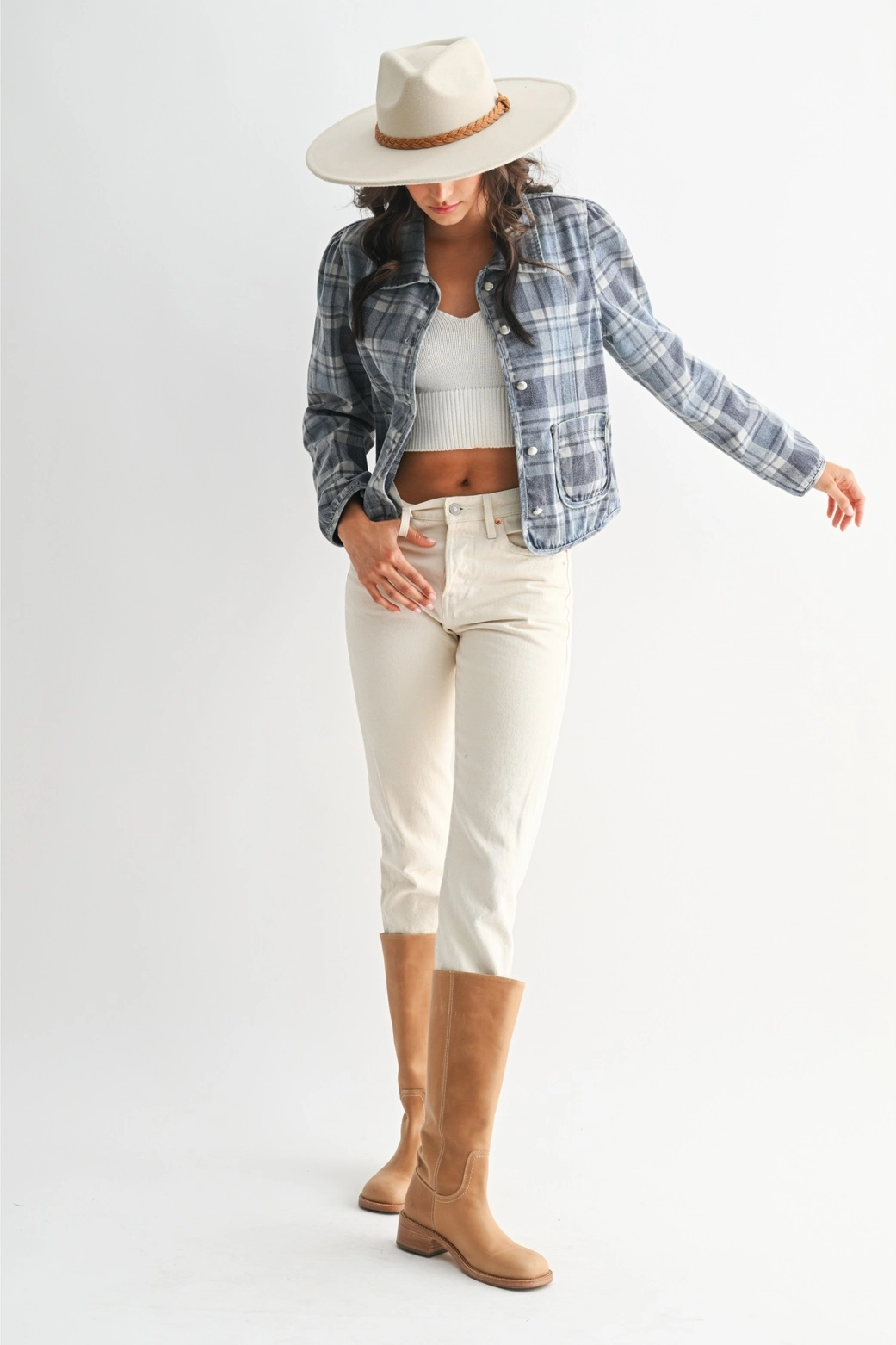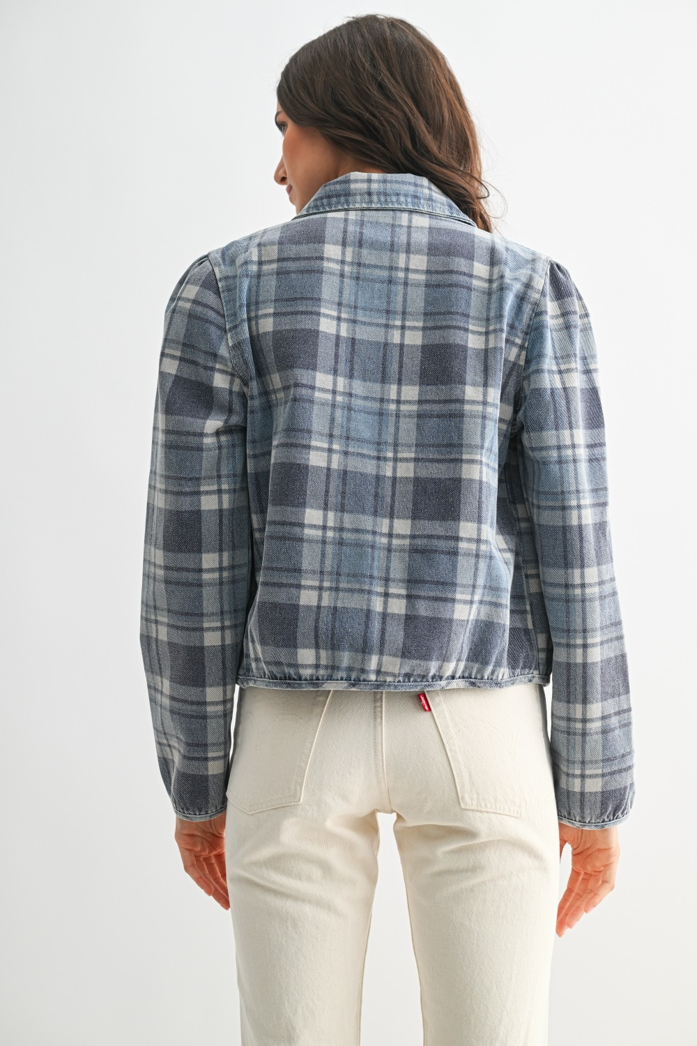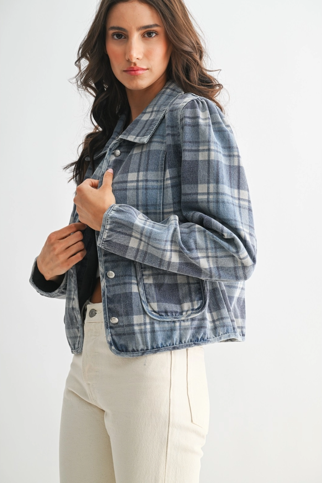 Elevate your wardrobe with this chic plaid denim jacket, perfect for casual outings and stylish layering. The timeless plaid pattern adds a classic touch, while the denim fabric ensures durability and comfort. Whether paired with jeans or a skirt, this versatile jacket is a must-have for any fashion enthusiast.