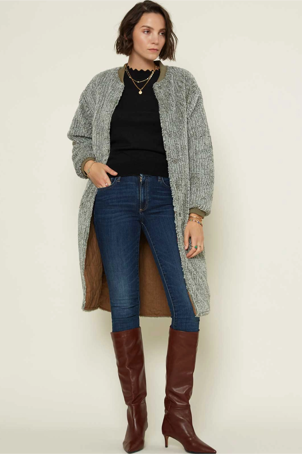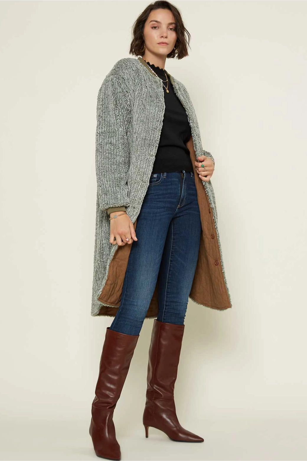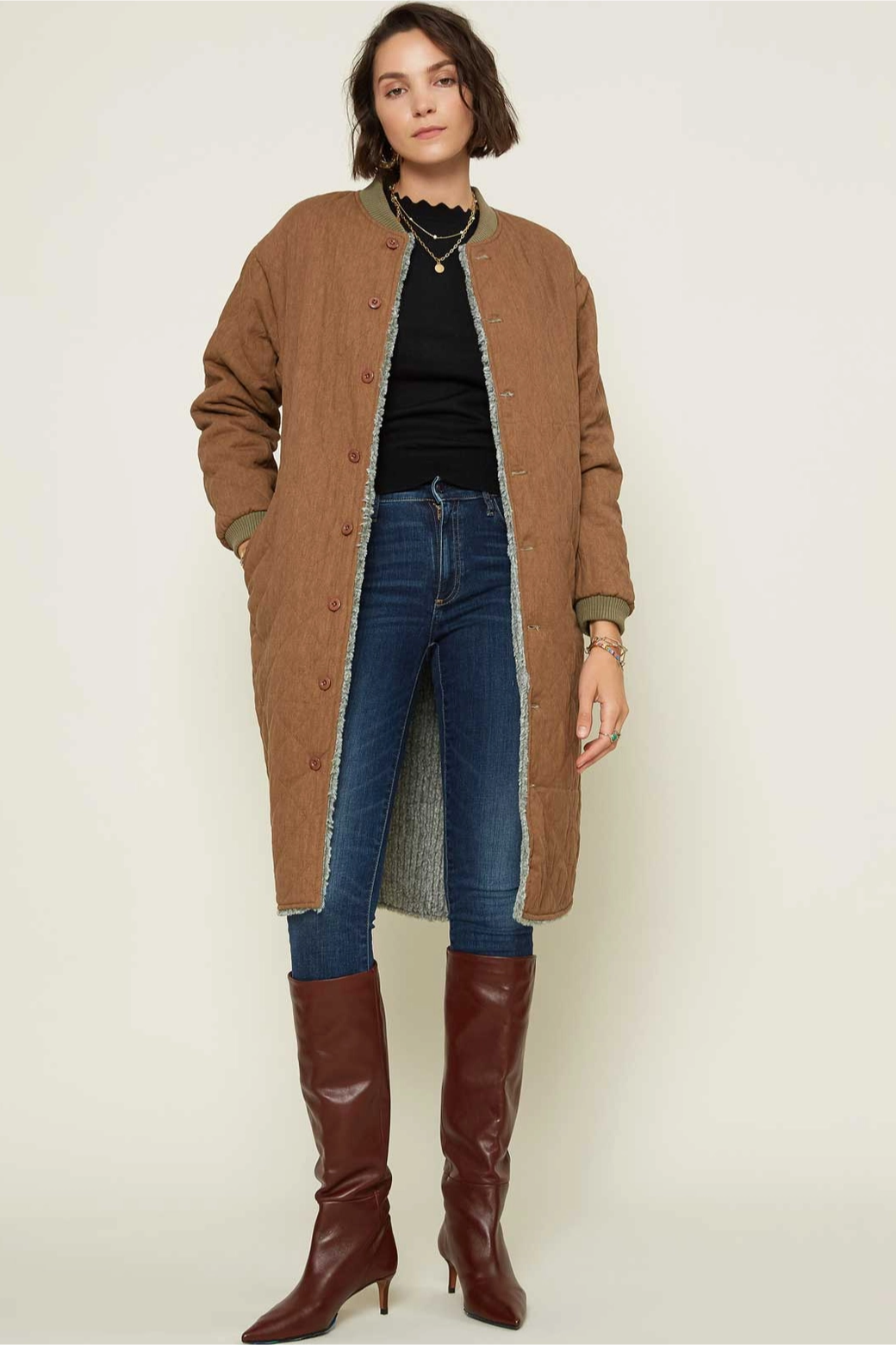Reversible faux shearling to brown quilted jacket