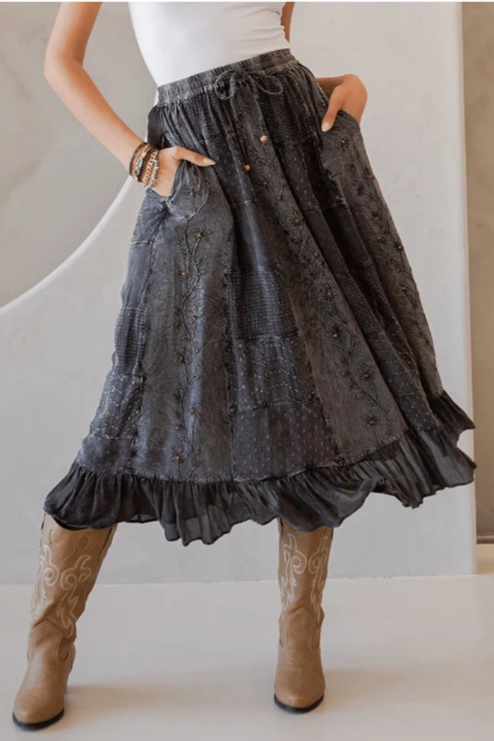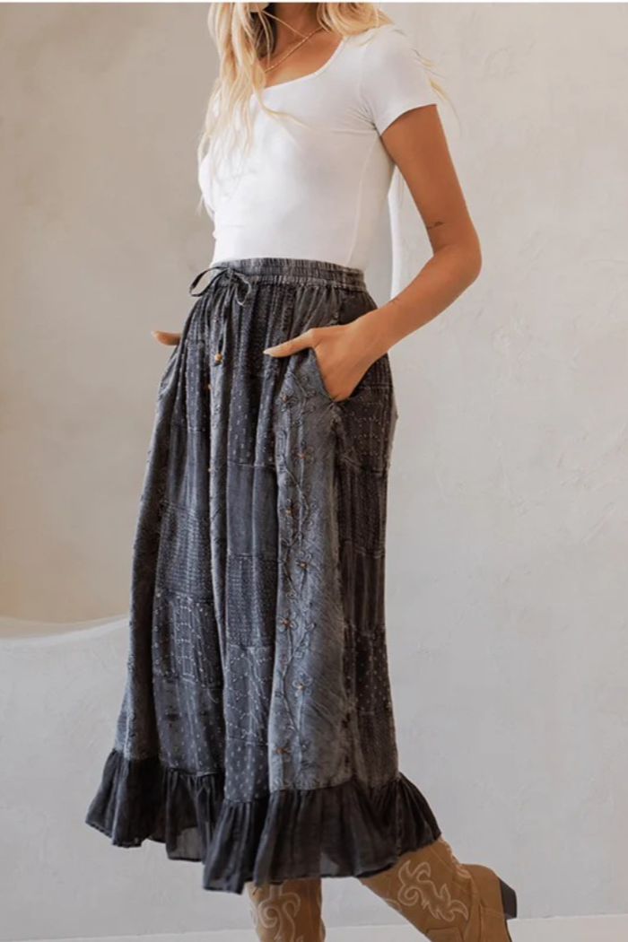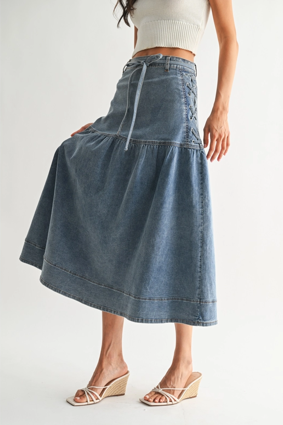 Camellia Denim Midi Skirt w/ Lace Up Detail