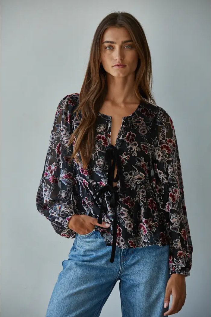 Woven Polyester Nylon Velvet Floral Print Round Neck Open Front Ribbon Tied Detail Long Sleeve Blouse Top.