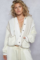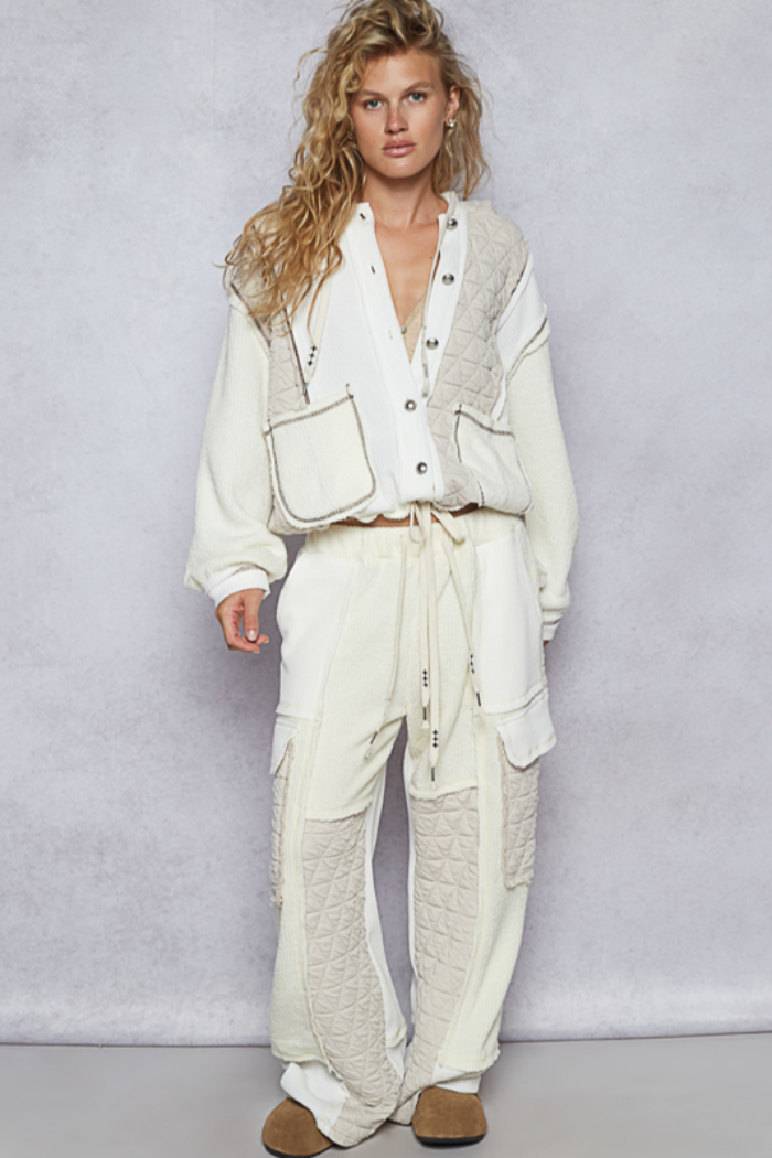 Designed in button down oversized fit jacket with hoodie featured in thermal, quilted knit and cut and sew sweater knit.