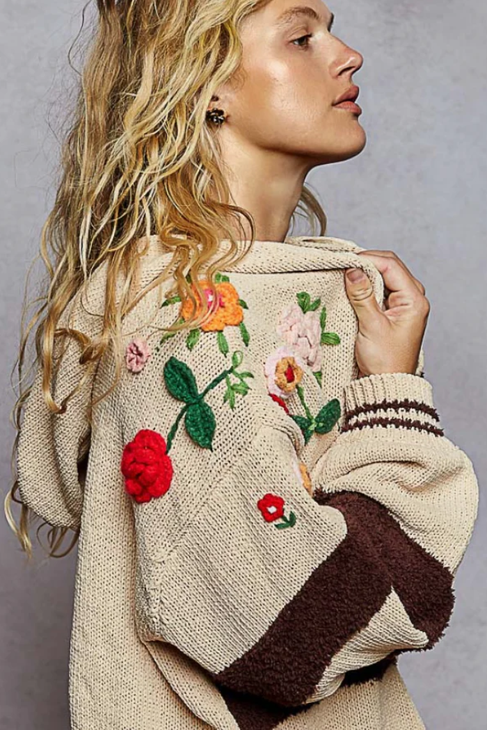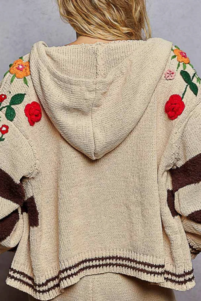 POL Clothing Mocha Stripe & 3D Floral Embroidered Hoodie (Medium)
