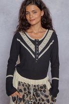 Designed in V-neck long sleeve regular fit top in rib with trim point, elastic loop button, outseam, double gauze wrist point, vintage washing, solid color.