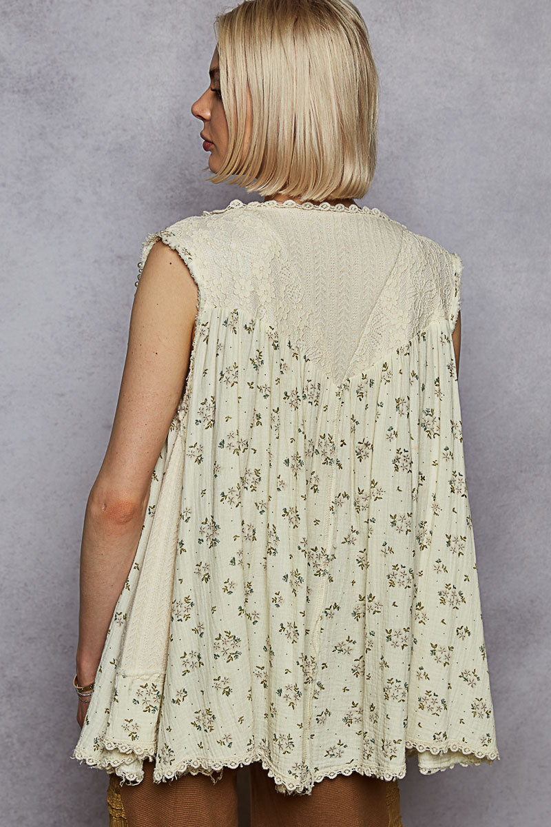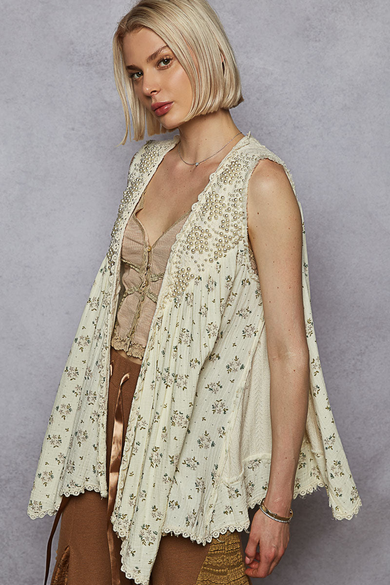 Designed in open cardigan, sleeveless, A-line fit top in printed double gauze with pearl detail pointed floral pattern.