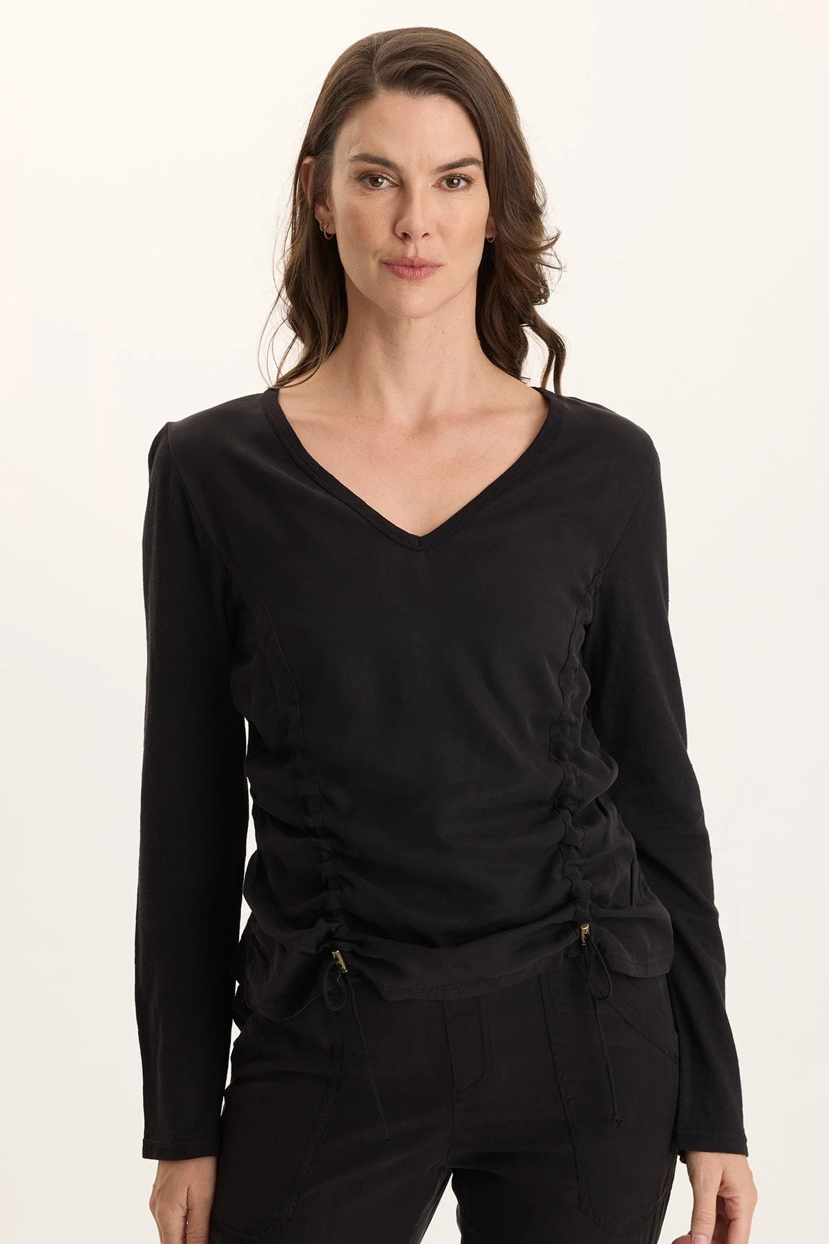 Two curved channels created with adjustable cords offer customizable ruching to this contrast-fabric style. A twill front body creates dynamic texture and movement-friendly stretch when paired with a Slub Jersey back, sleeves, and trim at the v-neck.