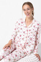 A soft two-piece pajama set cut from breathable bamboo fabric with a sweet floral stripe print. The Bellabu Bear Floral Stripes Bamboo Women's Pajama Set includes a button-front, long-sleeve top and coordinating long pants for easy layered comfort. Lightweight and silky to the touch, this set is ideal for cozy nights and relaxed mornings. The romantic floral detail and piping trim give it a charming, feminine look.